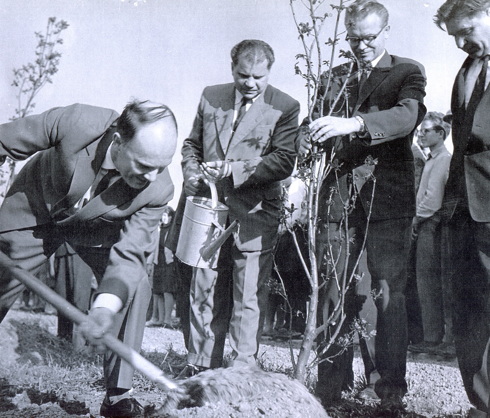 З новою силою будівництво Ботанічного саду розгорнулося ще до завершення Другої світової війни, після визволення Києва. З березня 1944 року на Звіринці знову закипіла робота і будівництво Саду, який у липні того ж року отримав статус самостійної установи Академії наук, очолив його видатний український вчений-ботанік і селекціонер, академік Микола Миколайович ГРИШКО (1901-1964). Під його керівництвом була розроблена наукова частина генерального плану будівництва Ботанічного саду згідно з постановою Раднаркому України “Про відновлення будівництва і наукової діяльності Центрального республіканського ботанічного саду АН УРСР в м. Києві”. Архітектурно-планувальну частину повоєнного проекту виконав академік архітектури О.В.ВЛАСОВ, на той час головний архітектор Києва. На першому повоєнному етапі будівництва Ботанічного саду була зосереджена увага на організації експедицій і наукових відряджень для накопичення і формування колекцій рослин. Велись пошуки найбільш цінних і необхідних видів і форм рослин з різних куточків світу, їх розмноження, формування експозицій. Зібрані колекції слугували базою формування напрямків наукових досліджень, основою яких на той час була мобілізація рослинних ресурсів на користь суспільству – створення і впровадження нових видів, форм і сортів рослин в різні галузі господарства. Заслуги першого директора повоєнного часу академіка М.М.ГРИШКА і невеликого колективу ботсадівців, в основному з числа вчорашніх фронтовиків, неоціненні, адже саме їх зусилля дали змогу створити унікальний за розмірами і складом ботанічний сад, вдало розмістити колекції і експозиції рослин і поєднати дослідницькі цілі з цілями освіти, виховання та відпочинку. Послідовники оцінили їх подвиг – подвиг справжньої самопожертви.