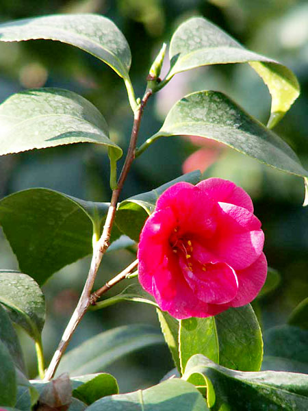 Листки прості, еліптичні аж до широко- та продовгувато-яйцевидних, шкірясті, глянцуваті, загострені чи тупі, по одному, інколи по 2-3, розміщуються по черзі на коротких черешках. Квітки поодинокі, пелюстки зрослі біля основи, рожеві, червоні, білі чи строкаті, тичинки численні.